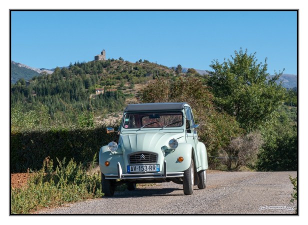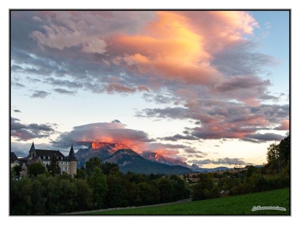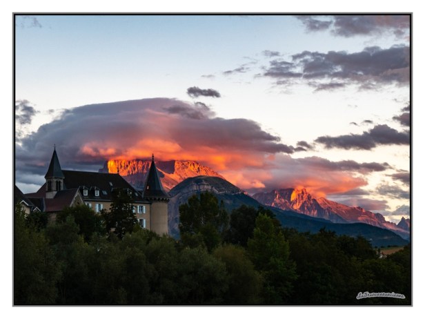 Une chance incroyable alors que je travaillais sur les photos de la journée, je suis ressorti de l’hôtel pour aller chercher la glacière dans la 2cv. Oh quel spectacle, ce coucher de soleil sur le château et les sommets. Vite, mon appareil… à zut, la carte mémoire est dans le PC… Je me dépêche pour ne rien louper du spectacle…