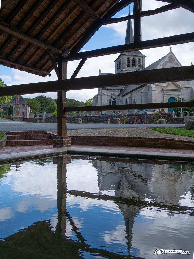 Eglise de St Hymer en reflet dans le lavoir – Nous avons cherché la tombe de la Mère Denis sans succès.