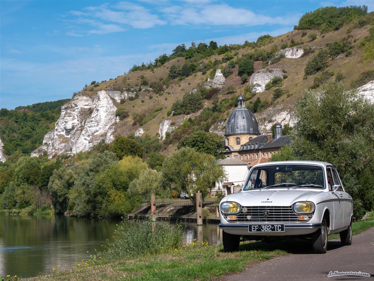 Nous voilà rentrés dans notre ville des Andelys (27). La 204 sur le quai Grimoult devant la Seine et l’ancien hôpital.