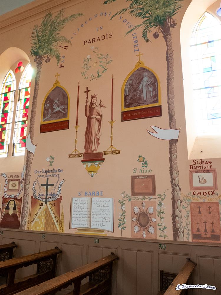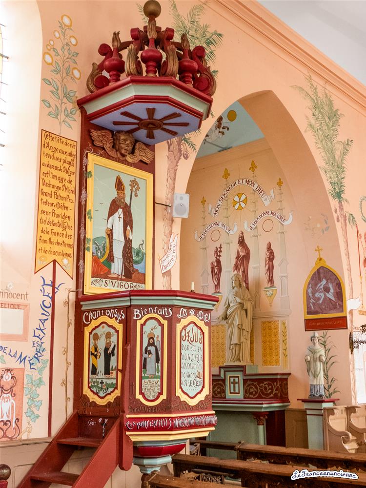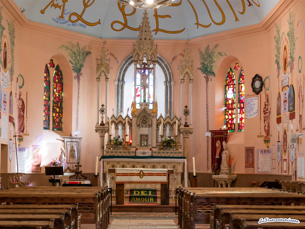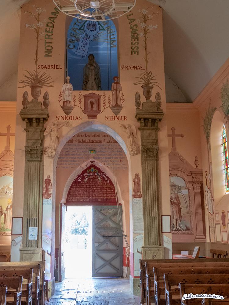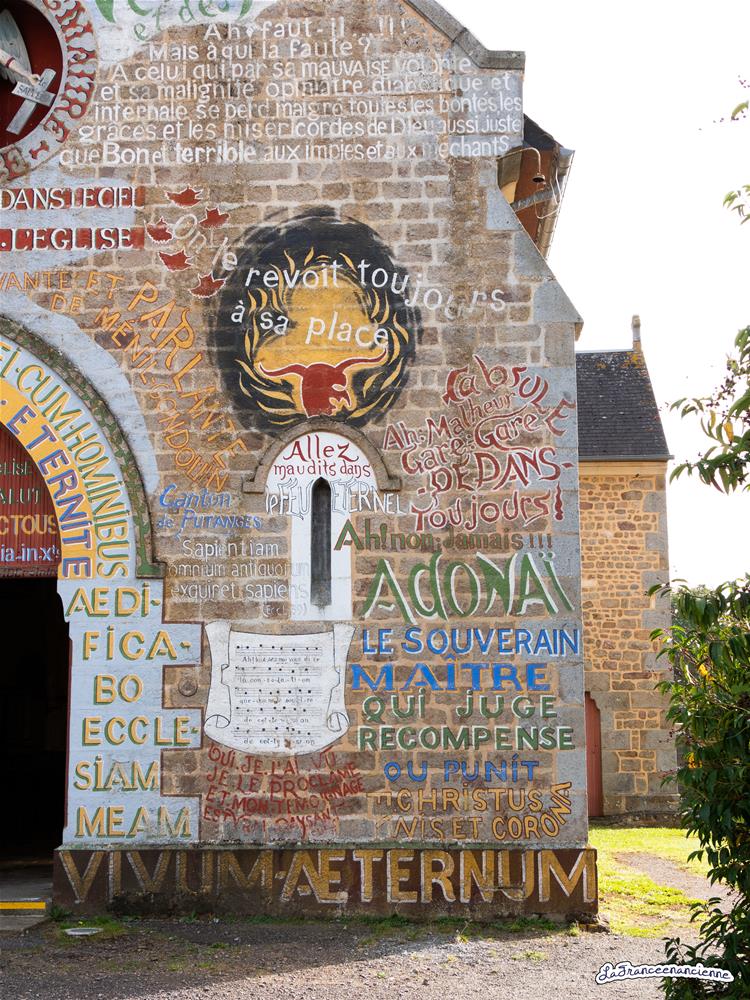 Eglise St Vigor à Ménil-Gondouin – L’Abbé Paysant, nommé en 1873 curé de Ménil Gondouin, réalise lui-même la décoration intérieure et extérieure de son église. Entre 1873 et 1921 le sol et les murs sont couverts d’écritures saintes et de citations peintes ou gravées. Afin de parfaire cette décoration l’abbé a accumulé au fil des ans d’innombrables statues, tableaux et symboles qu’il dispose dans l’édifice. Son église devient alors « l’Eglise vivante et parlante », organisée comme « un immense reliquaire », ‘un musée chrétien », unique en son genre. Restaurée telle qu’à l’origine.