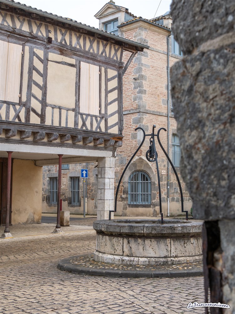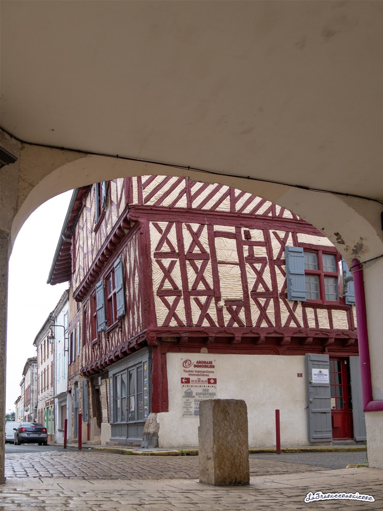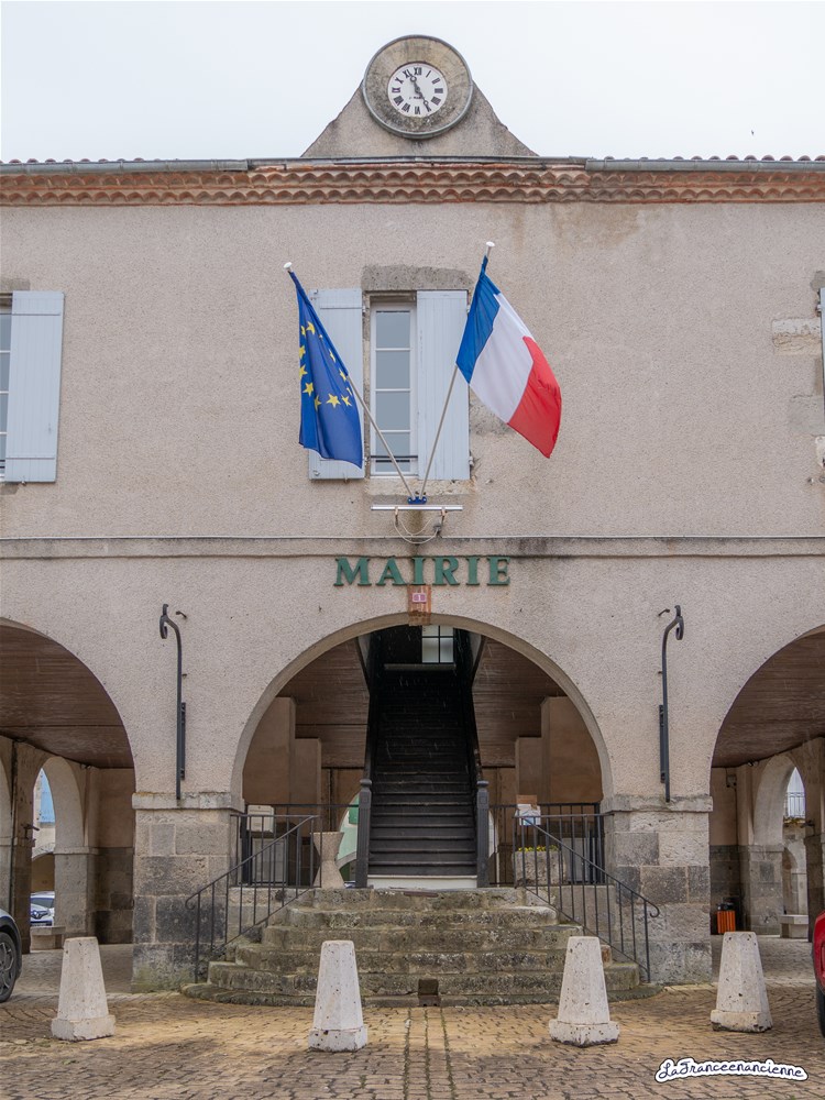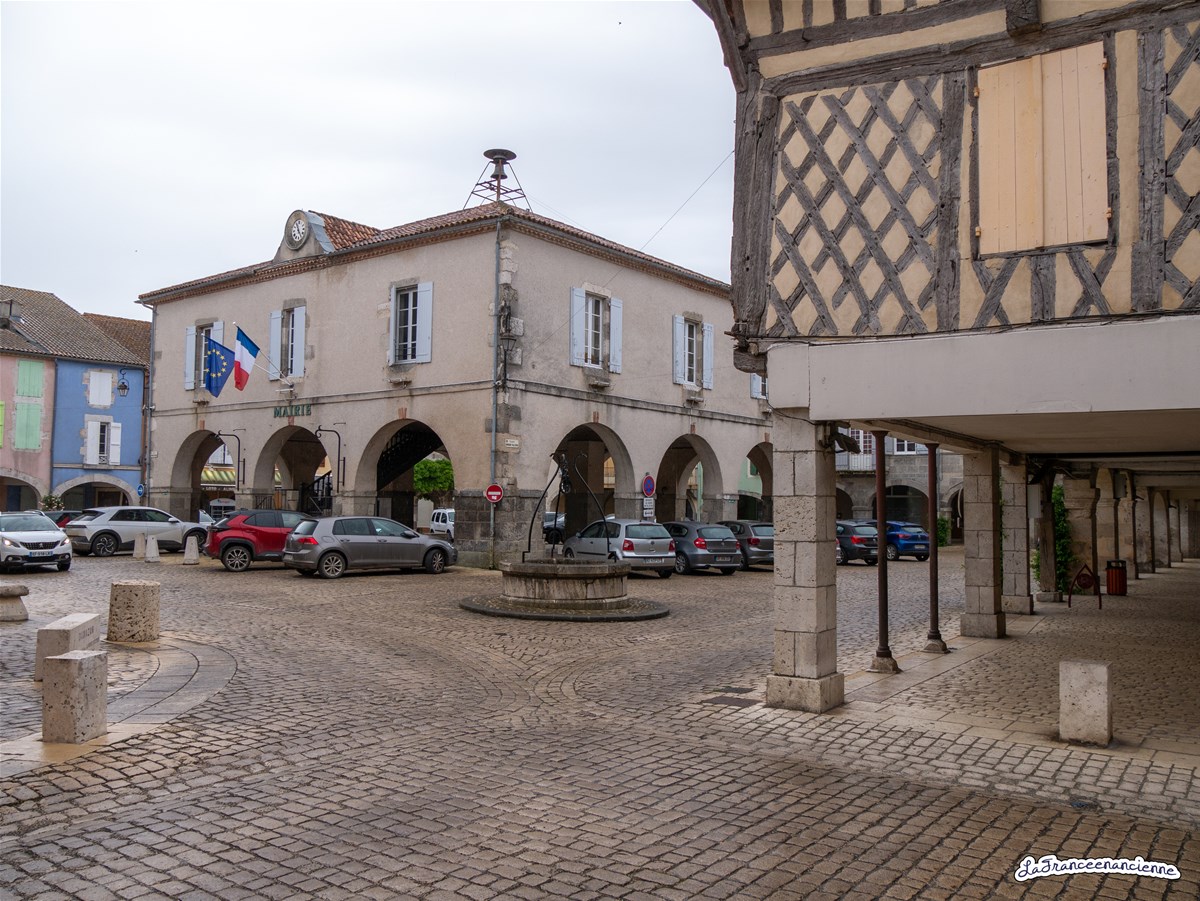 Damazan (Lot-et-Garonne) sous la pluie. Remarquez que la mairie se trouve au dessus des halles.