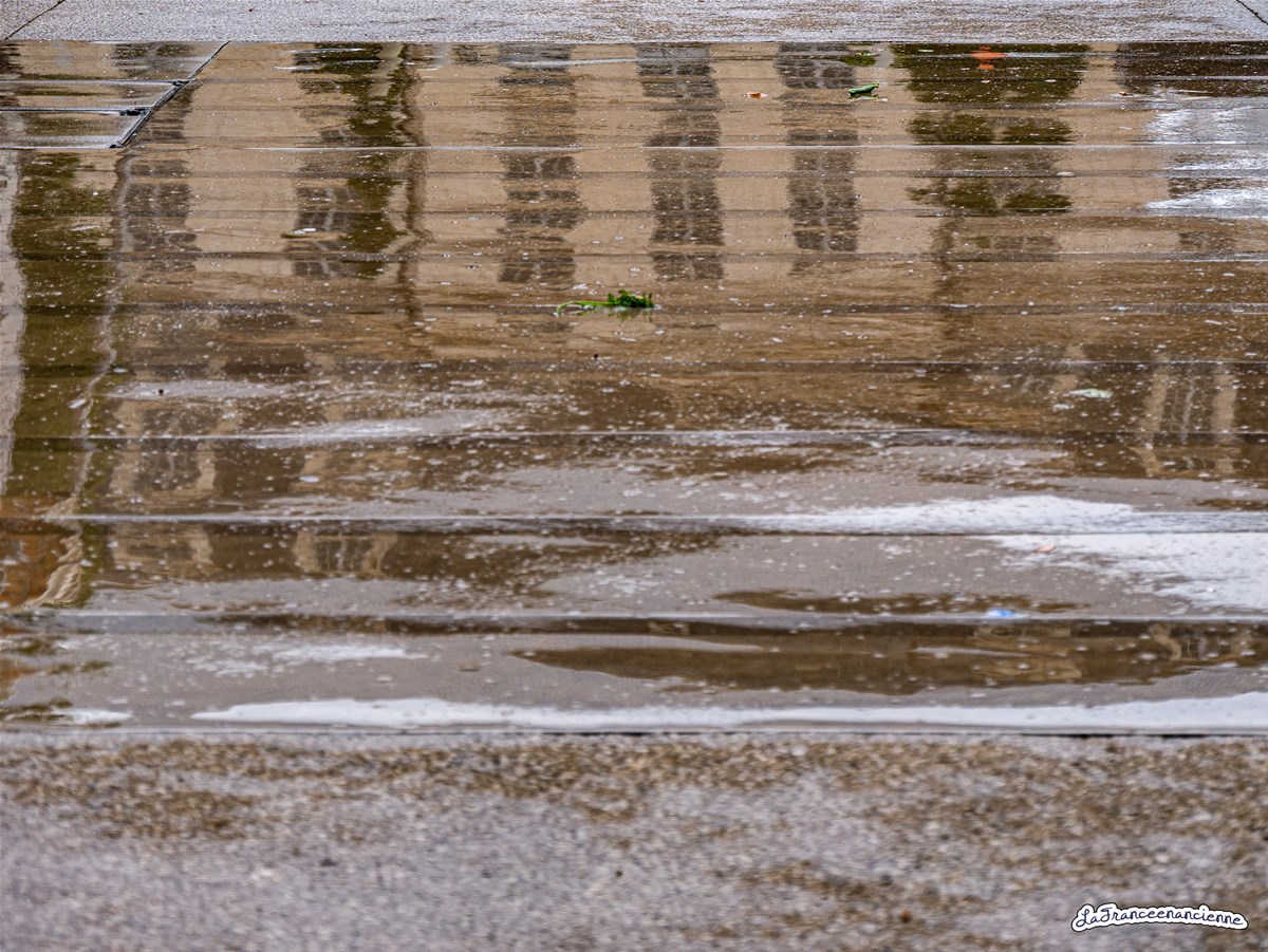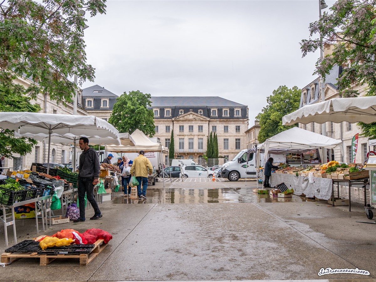 Aiguillon et son marché devant la château – reflet du château dans les flaques de la place.