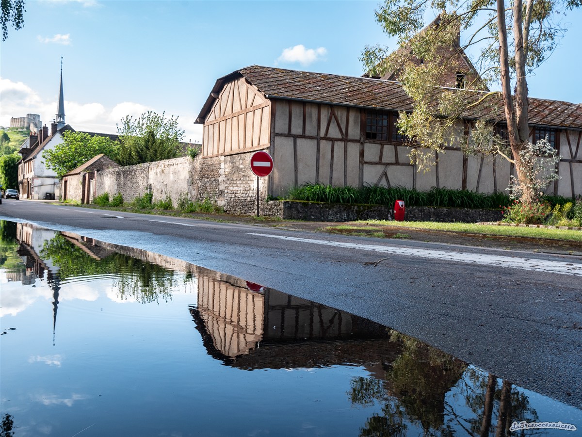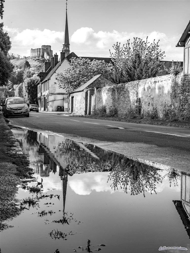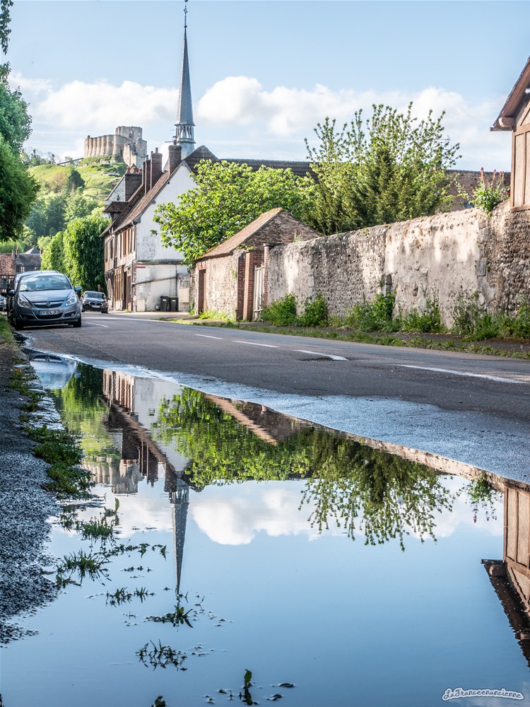 Merci Alain, j’ai aussi rencontré une belle 304 cab et le propriétaire qui pourrait venir à la Balad’Eure. J’attends de ses nouvelles. L’intérêt de se balader avec un appareil photo en permanence est pouvoir dégainer en toute circonstance ! La pluie de la nuit a apporté une belle flaque en face de la boulangerie du Petit Andely. J’ai tout de suite vu le reflet du château et de l’église que je n’avais plus qu’à immortaliser.