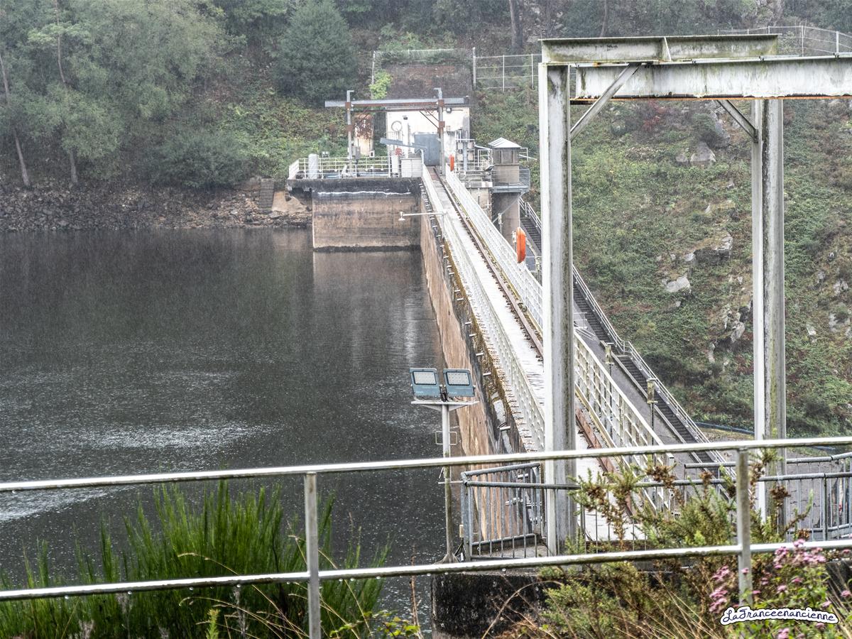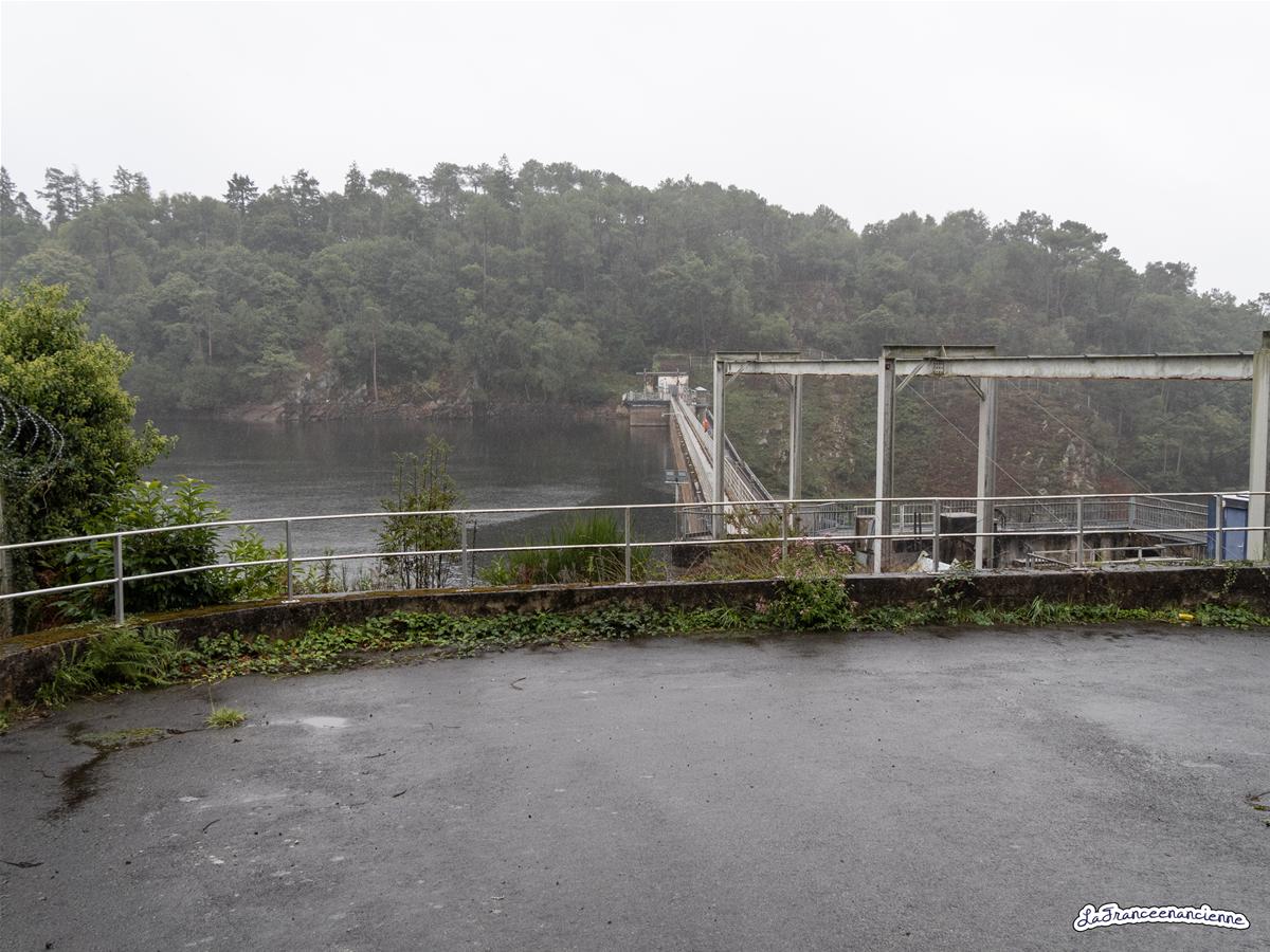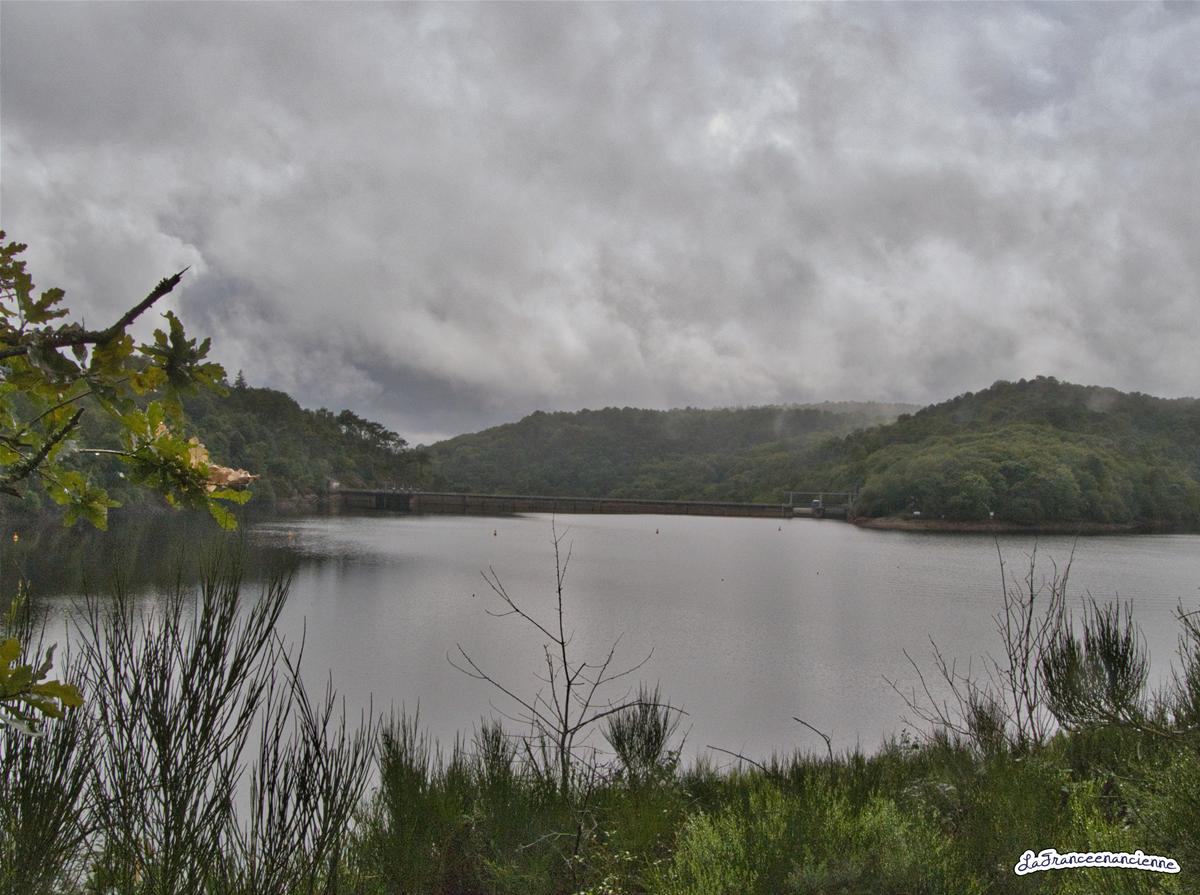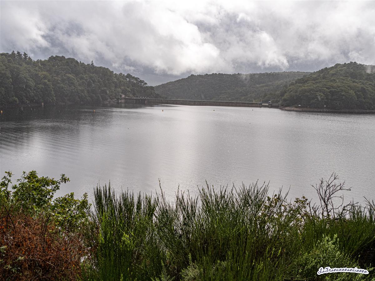 Le barrage et le lac de Guerlédan sous la pluie et la brume.
