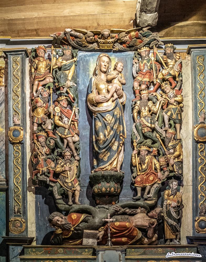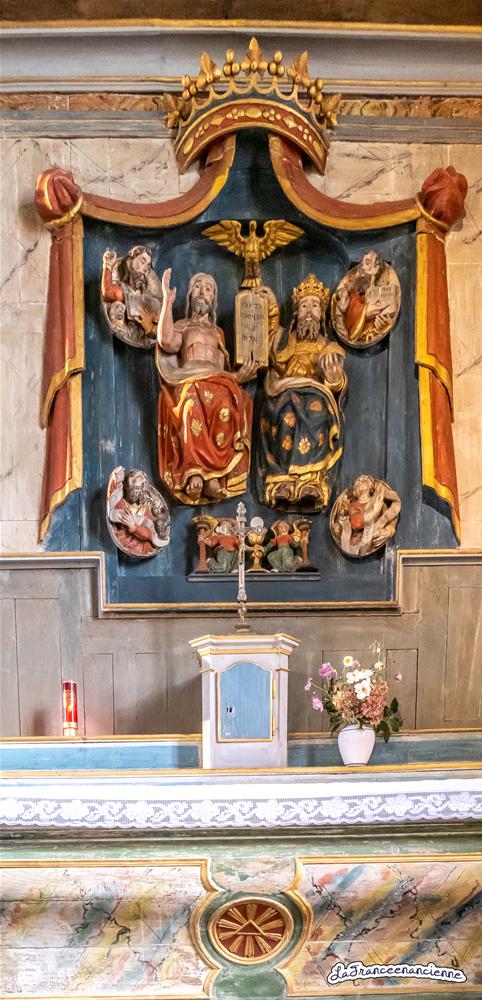 L’intérieur a été réaménagé à la fin du 19e siècle avec du mobilier appartenant à d’autres lieux de culte. Deux éléments de retable du 16e siècle sont conservés dans les bras du transept. Celui exposé au nord représente l’arbre de Jessé avec de très nombreux personnages en haut-relief et celui situé au sud représente la Trinité.