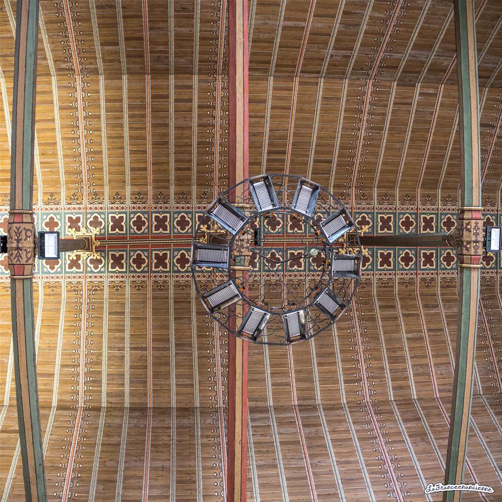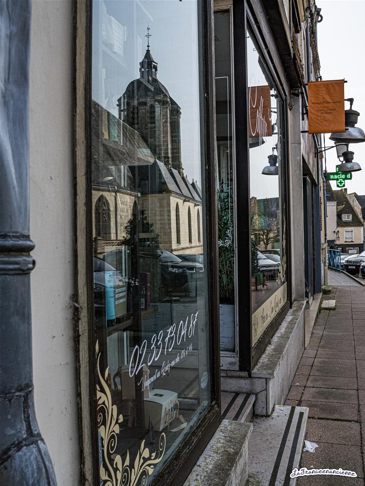 L’église St-Sauveur en reflet sur la vitrine du coiffeur.